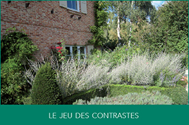 L'art du jardin permet de jouer avec un grand nombre de contrastes. Ils peuvent être immédiats : par exemple par les formes taillées ou libres, les textures fines ou épaisses ...Ils peuvent également se lire dans le temps : les couleurs de printemps et d'automne, la variété des ambiances, la comparaison entre l'exhubérance du printemps et la sobriété de l'hiver ...